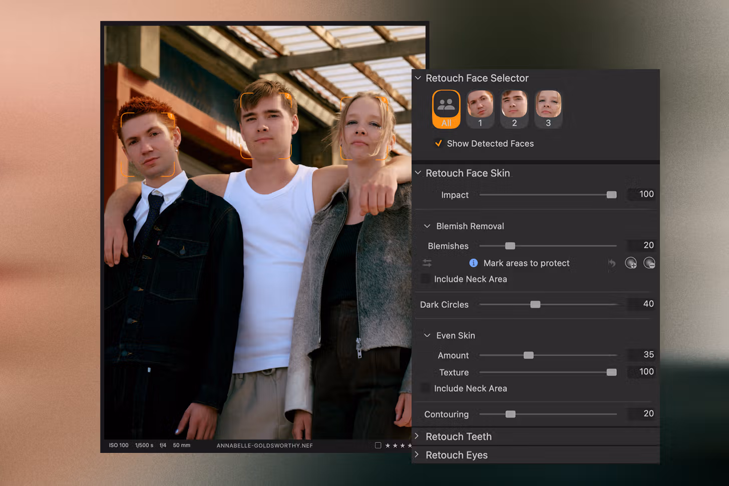 Automatically detect faces and choose to edit them individually or all at once—your workflow, your call.